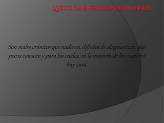 Este documento contiene información sobre varias enfermedades invisibles como la esquizofrenia, el Alzheimer, el Asperger, el autismo, la locura y el Parkinson. Describe los síntomas y causas de cada una de estas enfermedades, así como cómo se manifiestan y propagan en el cerebro. El documento también proporciona detalles sobre un colegio y un curso en particular.