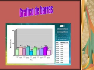 Este documento describe diferentes tipos de distribuciones de frecuencias y gráficos estadísticos, incluyendo tablas de frecuencias, histogramas, polígonos de frecuencias acumuladas y diagramas de sectores. Explica conceptos como frecuencia absoluta, relativa y acumulada, así como cómo se construyen y utilizan estos gráficos para resumir y visualizar datos estadísticos.