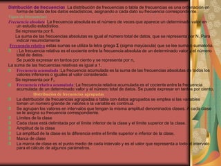 Este documento describe diferentes tipos de distribuciones de frecuencias y gráficos estadísticos, incluyendo tablas de frecuencias, histogramas, polígonos de frecuencias acumuladas y diagramas de sectores. Explica conceptos como frecuencia absoluta, relativa y acumulada, así como cómo se construyen y utilizan estos gráficos para resumir y visualizar datos estadísticos.