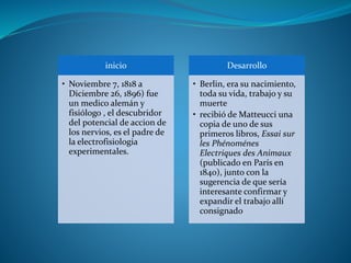 Ludwig Hermann fue un fisiólogo alemán que descubrió la existencia del potencial de acción en los nervios en 1845 utilizando un galvanómetro sensible. Observó que cuando los electrodos se colocaban cerca del extremo cortado de un nervio aislado, este extremo era negativo en relación al otro electrodo más alejado, demostrando así por primera vez cambios eléctricos asociados a la actividad nerviosa. Esto llevó a Hermann a afirmar correctamente que había demostrado la identidad entre la electricidad y el "princip