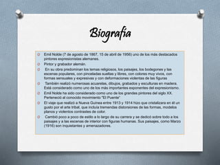 Emil Nolde fue un pintor y grabador alemán del expresionismo. Pintó escenas religiosas, paisajes, bodegones y escenas populares con colores vivos y formas expresivas. Viajó a Nueva Guinea y se interesó por el arte tribal. Creó numerosas acuarelas, dibujos y grabados considerándose uno de los más importantes exponentes del expresionismo.