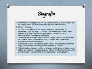 Emil Nolde fue un pintor y grabador alemán del expresionismo. Pintó temas religiosos, paisajes y escenas populares con colores vibrantes y formas deformadas. Fue uno de los principales exponentes del movimiento expresionista y cambió su estilo a lo largo de su carrera dedicándose principalmente a paisajes y escenas interiores con figuras humanas.