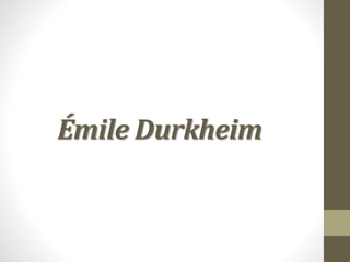 Émile Durkheim nació en 1858 en Francia y fue un pionero de la sociología moderna. Desarrolló teorías sobre la solidaridad social, la división del trabajo y los hechos sociales. Publicó obras influyentes como La división del trabajo social, Las reglas del método sociológico y Las formas elementales de la vida religiosa.