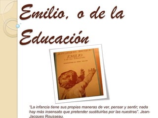 El documento presenta información sobre Jean-Jacques Rousseau y su obra Emilio o De la educación. Rousseau era un filósofo y escritor francés del siglo XVIII que aunque no era un pedagogo, hizo importantes contribuciones a la pedagogía a través de Emilio, un tratado sobre la educación y la naturaleza humana. Emilio explora temas políticos y filosóficos sobre la relación entre el individuo y la sociedad, proponiendo que el hombre es bueno por naturaleza.