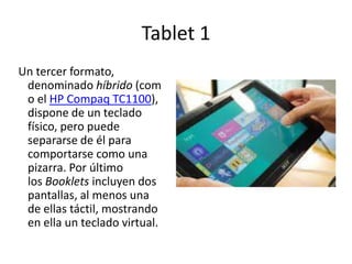 Este documento describe tres tipos principales de tabletas: tabletas de pizarra que carecen de teclado físico, tabletas híbridas que incluyen un teclado físico desmontable, y tabletas convertibles con un teclado giratorio o deslizable. También define una tableta como un tipo de computadora portátil más grande que un teléfono inteligente que se controla principalmente con los dedos en una pantalla táctil sin necesidad de un teclado o ratón físicos.