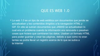 El documento describe la evolución de la Web desde la Web 1.0 hasta la Web 3.0. Explica que la Web 1.0 consistía en páginas estáticas creadas en HTML, mientras que la Web 2.0 introdujo sitios web interactivos y centrados en el usuario. Finalmente, la Web 3.0 se centra en proporcionar a los usuarios información personalizada mediante el uso de la inteligencia artificial y la normalización de contenidos.