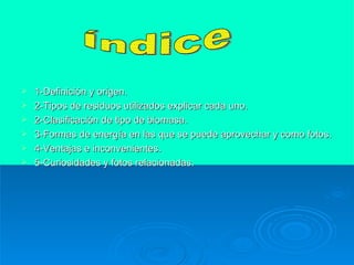 El documento describe la biomasa, incluyendo su definición como la masa total de organismos vivos, su origen a partir de la energía solar aprovechada por las plantas, y los principales tipos de biomasa como residuos sólidos urbanos, residuos forestales, residuos agropecuarios, biomasa natural, biomasa residual, cultivos energéticos y excedentes agrícolas. También explica cómo la biomasa puede aprovecharse para producir energía térmica, electricidad y biocombustibles, así como las ventajas e inconvenientes