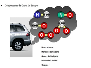 Los hidrocarburos son compuestos orgánicos formados por carbono e hidrógeno que al quemarse incompletamente generan emisiones dañinas como monóxido de carbono, hidrocarburos y óxidos de nitrógeno. Estas emisiones se producen cuando la combustión no es completa debido a mezclas de aire y combustible demasiado ricas o pobres, y pueden causar problemas de salud y contaminación ambiental.