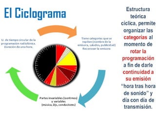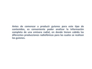 Este documento describe las características y el funcionamiento de una emisora radial, con un enfoque en las áreas y la programación informativa. Explica que una emisora radial está dividida en departamentos como administración, producción y redacción, y que la programación informativa incluye boletines horarios, noticieros y entrevistas. También detalla los roles de los periodistas y productores en la recopilación y presentación de noticias de manera concisa y oportuna.