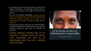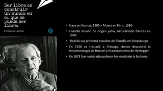 Emmanuel Lévinas fue un filósofo lituano-francés que desarrolló una filosofía centrada en la noción de "otredad". Su obra más importante, Totalidad e Infinito, explora la relación entre el yo y el otro, argumentando que la comprensión total del otro elimina su alteridad. Lévinas propone que la mejor forma de relacionarse con el otro es a través de la hospitalidad y la caricia, dando prioridad a las necesidades del otro por encima de las propias.
