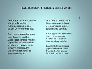 La persona le pide a Dios que le conceda a su hijo ser un hombre de paz y compasión, que tenga luz para comprender, que sea guiado por la fe, que no caiga en la ira, avaricia u odio, y que escuche la voz de su corazón. También agradece a Dios por su bondad.