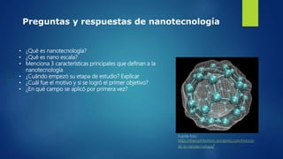 Este documento presenta información sobre nanotecnología y sus aplicaciones en energías renovables. Explica conceptos clave como nano escala, las características de la nanotecnología y los primeros estudios e investigaciones en este campo desde 1959. También describe cómo la nanotecnología se aplicó por primera vez en microscopía de campo cercano en los años 80 y menciona algunas aplicaciones actuales y potenciales en energía y medicina.