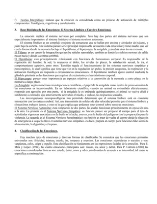 El documento define la emoción y describe sus componentes fisiológicos, cognitivos y conductuales. Explica que el sistema límbico, especialmente la amígdala, desempeña un papel clave en el procesamiento de las emociones. Además, clasifica las emociones primarias como felicidad, tristeza, miedo, ira, sorpresa y aversión; y las secundarias como vergüenza, celos, culpa y orgullo. Por último, profundiza en las emociones del miedo, rabia, am