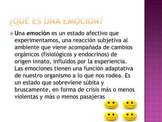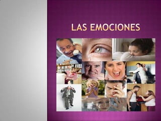 Este documento describe las principales emociones humanas, incluyendo el miedo, la rabia, la culpa, la depresión, los celos, la ansiedad, el resentimiento, la vergüenza y el amor. Explica que las emociones son estados afectivos que experimentamos en respuesta al ambiente y que cumplen una función adaptativa, aunque a veces pueden causar estrés. También señala que aprender a manejar las emociones mejora la salud y las relaciones interpersonales.
