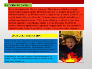 La ira es una emoción básica y universal que actúa como defensa y regulación social, siendo esencial para la supervivencia. Su manifestación puede ser saludable, pero su frecuencia y desproporción llevan a problemas, por lo que es fundamental aprender a controlarla y expresarla adecuadamente. Además, la ira se relaciona con la obstrucción de metas y la transgresión de normas, y su expresión debe ser guiada por la razón para evitar reacciones impulsivas.