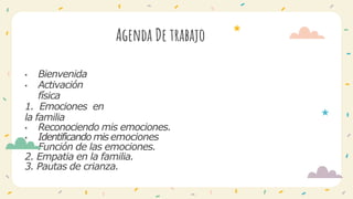 El documento presenta una sesión de un taller para madres, padres y tutores sobre emociones en la familia y manejo de emociones. La sesión incluye una bienvenida, activación física y tres temas principales: 1) emociones en la familia, reconociendo y identificando emociones y su función, 2) empatía en la familia, y 3) pautas de crianza. Se discuten conceptos como emociones universales, la diferencia entre emociones y sentimientos, cómo comunicar emociones en la familia y la importancia del