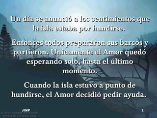 En una isla que albergaba sentimientos como el amor y la sabiduría, estos se enteraron de que la isla se hundiría. Todos menos el amor lograron escapar en barcos. Cuando el amor pidió ayuda a la riqueza, el orgullo y la tristeza, estos se negaron. Finalmente, el tiempo acogió al amor en su barco y lo salvó, pues solo él comprendía la importancia del amor.