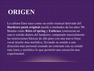 El movimiento emo surgió en la década de 1980 como un estilo musical derivado del hardcore punk con voces más melódicas. Actualmente, los emos suelen ser adolescentes entre 14 y 20 años que se visten de negro y se peinan el cabello sobre la cara, y escuchan bandas como My Chemical Romance y Blink-182. Se identifican como mentes inconformistas y pesimistas sobre la sociedad.