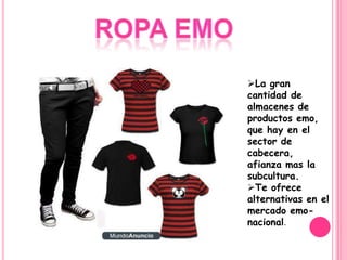Este documento ofrece alternativas de estilo para los emo, incluyendo ropa como camisetas ajustadas, jeans negros entubados y zapatos Vans o Converse, así como accesorios como riatas de taches y estrellas rosadas. También recomienda peinados como el pelo cubriendo el ojo derecho y piercings en la ceja y labio izquierdos. Menciona bandas populares entre los emo como Paramore, AFI y All American Rejects.