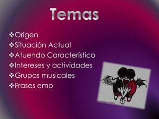 Este documento describe la cultura emo, incluyendo su origen en la música emo de los años 80, su popularidad en los 2000 y algunas de sus características clave. Los emos tienden a ser jóvenes entre 14-20 años que se visten de negro y oscuro, escuchan bandas emo populares, y a menudo tienen una visión negativa o dramática de la vida.