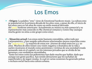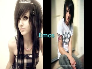 Los emos surgieron en los años 80 como un estilo musical derivado del punk hardcore americano. Actualmente se han extendido por todo el mundo, especialmente entre adolescentes de 14 a 20 años que se identifican con la visión negativa o dramática de la vida propia de la cultura emo. Los emos se caracterizan por su atuendo oscuro de ropa ajustada y peinados engominados, y suelen escuchar música de grupos emo populares como My Chemical Romance o Blink-182.