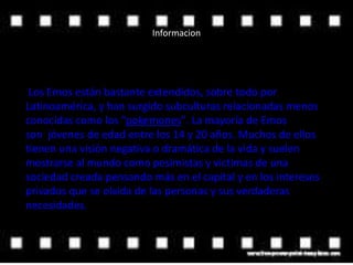 Los emos son una subcultura extendida en Latinoamérica compuesta principalmente por jóvenes entre 14 y 20 años que tienen una visión negativa de la vida y se muestran al mundo como pesimistas y víctimas de una sociedad centrada más en el capital que en las personas.