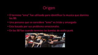 El documento describe la filosofía y estilo de vida de los emo. Los emo se caracterizan por ser tristes, amargados y antisociales debido a problemas emocionales. Siguen una filosofía de rechazo social y depresión constante. Usan símbolos como calaveras y corazones rotos. Escuchan música punk, emo y gótica. Visten de manera oscura con zapatos Converse, bufandas con capucha y jeans negros.