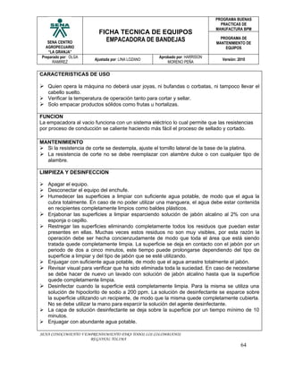 Este documento describe una empacadora de bandejas, incluyendo sus especificaciones técnicas, instrucciones de uso, características de uso, mantenimiento y limpieza. Proporciona detalles sobre el modelo, marca, peso, dimensiones y funciones de la máquina, así como los pasos para su operación, mantenimiento e higiene.