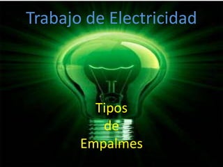Los empalmes son uniones entre conductores eléctricos para prolongar o derivar líneas. Para cables gruesos, la prolongación se realiza entrelazando los conductores, mientras que para cable dúplex se usan dos uniones western. Los empalmes entre cables delgados deben hacerse de forma escalonada. Para derivar cable dúplex se usan dos empalmes toma sencilla separados. Las conexiones entre cables y alambres se logran juntando los conductores y enrollándolos con uno más delgado.