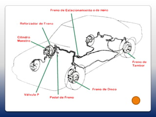 El documento describe los sistemas de frenos en automóviles, incluyendo frenos hidráulicos, circuitos de frenos básicos y de doble circuito, y sistemas ABS. Explica los principios básicos de funcionamiento de los frenos hidráulicos, y los componentes clave de los sistemas de frenos modernos como módulos de control, sensores de ruedas y cuerpos de válvulas.