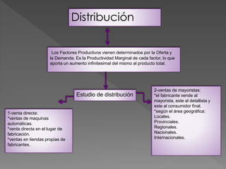 El documento habla sobre la comercialización y la distribución. Explica que la comercialización incluye todas las actividades relacionadas con las transacciones, desde las micro hasta las macro transacciones que afectan a toda la economía. También describe dos métodos principales de distribución: la venta directa a través de máquinas automáticas, tiendas propias u otros medios, y la venta a través de mayoristas que luego distribuyen los productos a detallistas y consumidores finales en diferentes áreas geográficas.