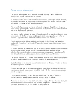 La CUN y la Universidad de Oklahoma organizarán el primer Mercury Robotic Challenge en Latinoamérica en Colombia, donde 9 equipos de estudiantes de ingeniería, incluyendo 7 equipos colombianos y 2 internacionales, competirán diseñando y controlando remotamente un robot que complete un circuito con obstáculos a más de 80 km de distancia. El concurso promueve la innovación tecnológica y el desarrollo de habilidades en ingeniería.