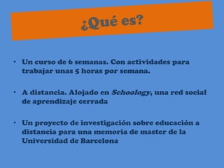 Este documento describe un curso de español a distancia de 6 semanas que se llevará a cabo en la plataforma Schoology. Los estudiantes deberán completar 3 actividades semanales de forma individual, en grupo y mediante videollamadas de Skype. La evaluación se realizará semanalmente y los estudiantes deberán alcanzar al menos el 60% de la puntuación total para aprobar el curso.