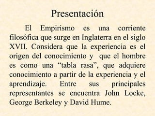 Este documento presenta el tema del Empirismo como una corriente filosófica que surge en el siglo XVII en Inglaterra. Considera que la experiencia es la fuente del conocimiento y que el hombre es como una "tabla rasa" que adquiere conocimiento a través de la experiencia y el aprendizaje. El objetivo es que los estudiantes comprendan el Empirismo como una teoría del conocimiento mediante la búsqueda y lectura en diccionarios filosóficos. La metodología consiste en que los estudiantes realicen esta búsqu