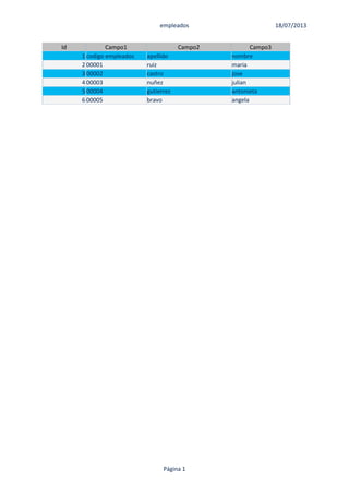 El documento contiene información de 6 empleados dividida en 3 páginas. En la primera página se incluyen los campos de código, apellido y nombre de cada empleado. La segunda página incluye datos adicionales como cédula, teléfono, correo electrónico, dirección y fecha de ingreso. La tercera página lista el cargo de cada empleado.