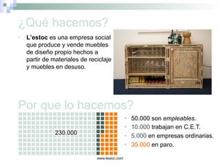 L'estoc es una empresa social de Barcelona que produce y vende muebles de diseño a partir de materiales reciclados, enfocándose en la inclusión laboral de personas desempleadas. Ha logrado reconocimiento por su impacto social y ambiental, con un retorno social de inversión de 5,41. Ofrece productos únicos y servicios de diseño, apuntando a un público sensibilizado con la sostenibilidad y la responsabilidad social.