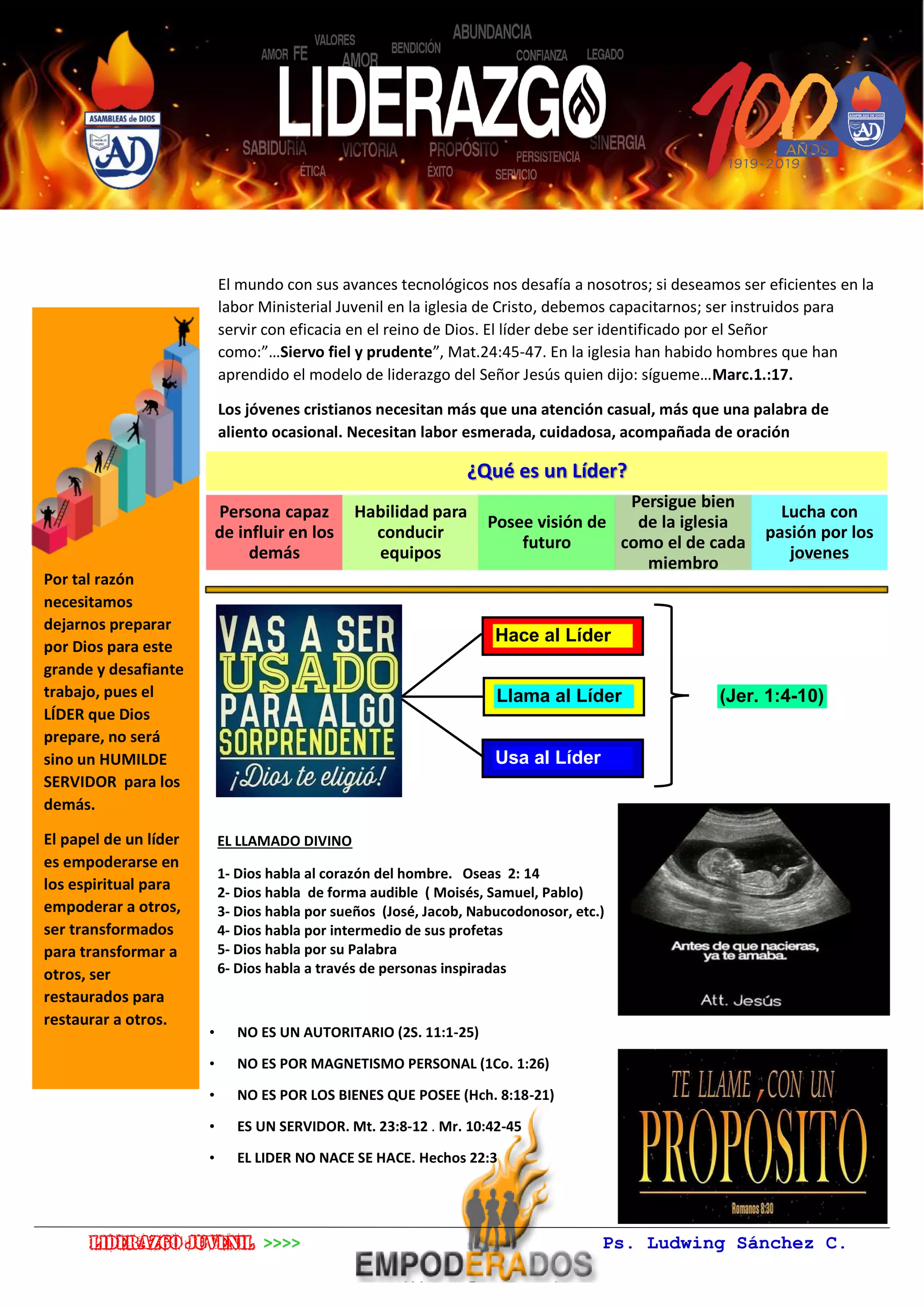 Este documento describe las cualidades de un buen líder juvenil desde una perspectiva cristiana. Un buen líder debe dejarse preparar por Dios y servir humildemente a los demás. También debe empoderarse espiritualmente para poder empoderar a otros. El líder debe seguir el ejemplo de Jesús de servir a los demás en lugar de buscar autoridad o beneficios propios.