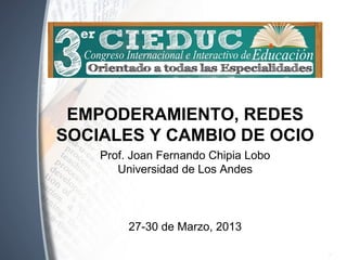 Este documento discute el empoderamiento, las redes sociales y el cambio del ocio digital. Argumenta que las tecnologías de la información y la comunicación (TIC) pueden usarse para empoderar a los estudiantes y promover un aprendizaje significativo si los docentes se capacitan y guían a los estudiantes hacia un pensamiento crítico. También sostiene que las redes sociales pueden transformarse de un ocio pasivo a uno productivo si se usan de manera planificada y reflexiva para fomentar la colaboración.