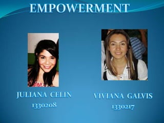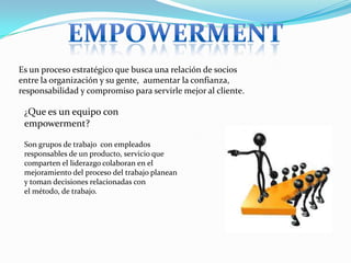 El documento describe los conceptos de equipos con empowerment y la implementación del empowerment en las organizaciones. Los equipos con empowerment comparten el liderazgo, son responsables de un producto o servicio, y toman decisiones relacionadas con su trabajo. Implementar el empowerment requiere definir funciones claras, puede tomar entre 15 meses y 5 años, y se enfrenta desafíos como la inercia y las dudas.