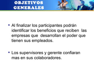 Este documento describe los beneficios del empoderamiento de los empleados y cómo las empresas pueden lograrlo. El empoderamiento significa dar poder y autoridad a los empleados para que se sientan dueños de su trabajo. Esto requiere compartir información, crear autonomía a través de fronteras claras, y reemplazar la jerarquía con equipos autodirigidos. Las empresas que empoderan a sus empleados obtienen mejores resultados como mayor satisfacción, compromiso y productividad.