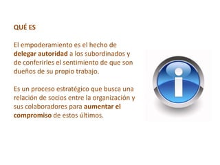 El empoderamiento es un proceso que delega autoridad a los colaboradores, fomentando su responsabilidad y proactividad en el trabajo. Busca una relación colaborativa que aumenta el compromiso y, en consecuencia, la productividad, superando barreras psicológicas y organizativas mediante el coaching y el autodesarrollo. Un plan de acción claro y una evaluación constante son clave para el éxito en este proceso.