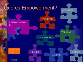 El documento describe el empowerment como una filosofía de gestión que implica la delegación de poder en todos los niveles de una organización para crear responsabilidad total. El empowerment mejora el significado del trabajo, la participación de los empleados, el desarrollo del equipo y el rendimiento al fomentar la responsabilidad compartida, la confianza y el liderazgo participativo. Sin embargo, requiere un cambio de cultura y mentalidad en toda la organización para tener éxito.