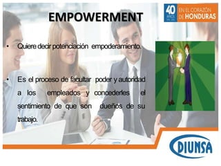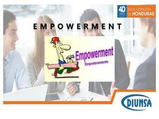 El documento habla sobre el concepto de empowerment o facultamiento. Explica que es un proceso para dar poder y autoridad a los empleados para que se sientan dueños de su trabajo. Esto requiere cambios en las organizaciones para eliminar la burocracia y dar libertad y capacitación a los gerentes y empleados. El empowerment se logra compartiendo información, creando autonomía y reemplazando la jerarquía con equipos autodirigidos. Esto trae beneficios como mayor satisfacción, compromiso y calidad del trabajo.