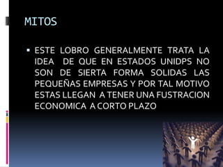 Este documento resume varios mitos sobre el emprendimiento. Explica que no necesariamente alguien que abre un negocio es un emprendedor, sino que debe saber resolver problemas para mantener su empresa. También señala que la personalidad del director o emprendedor a cargo puede influir en el objetivo y ambición de los empleados. Por último, concluye que el deseo de progreso depende de cómo se emplean los recursos y se trata a clientes y empleados.