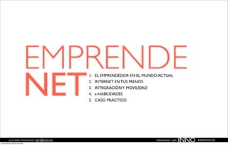 El documento explora el concepto de emprendimiento en el contexto actual, resaltando las habilidades necesarias, como la capacidad de identificar oportunidades y asumir riesgos. Además, se analiza el impacto de internet y las herramientas digitales en la creación de empresas y en la comunicación emprendedora. Finalmente, se discuten las habilidades electrónicas esenciales para el éxito en el mundo emprendedor moderno.