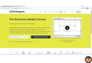 El documento presenta el Business Model Canvas (BMC) como una herramienta para emprender negocios. Explica que el BMC consiste en un lienzo con nueve bloques que ayudan a describir, analizar y desarrollar el modelo de negocio de una empresa. También incluye un ejemplo del BMC de Uber para ilustrar cómo se puede utilizar esta herramienta.