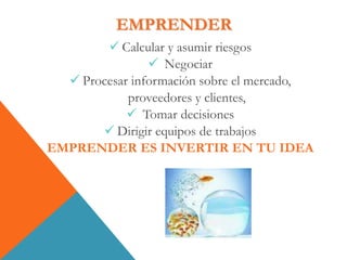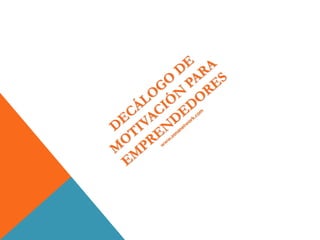 Este documento presenta una sesión empresarial sobre la motivación para emprender. Ofrece información sobre las características de una persona emprendedora, las competencias necesarias para emprender con éxito como la energía, la visión y la capacidad de asumir riesgos. También analiza factores como si se nace o se hace emprendedor y ofrece consejos para emprender, evitar errores comunes y combatir el miedo al fracaso. El objetivo final es inspirar a los asistentes a perseguir sus sueños y proyectos empresariales