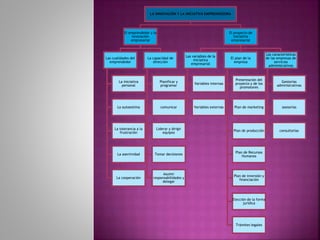 El documento describe los aspectos clave de iniciar un negocio, incluyendo las cualidades de un emprendedor como la creatividad y la innovación, y las habilidades necesarias como la iniciativa personal, la tolerancia a la frustración y la cooperación. Explica las variables internas y externas que afectan una iniciativa empresarial y los pasos para crear un plan de negocio exitoso, que incluye planes de marketing, producción, recursos humanos, inversión y legal. También proporciona ejemplos de empresas de servicios como gestor