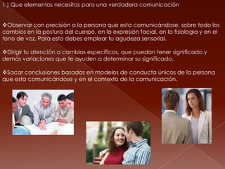 Este documento trata sobre los elementos necesarios para una comunicación efectiva, como observar con precisión los cambios en la postura, expresión y tono de voz de la otra persona. También explica cómo la incongruencia en la comunicación, como reírse de una muerte cercana, puede generar desconfianza, enojo y confusión. Además, describe cómo los contextos social, histórico, psicológico y cultural influyen en la comunicación.