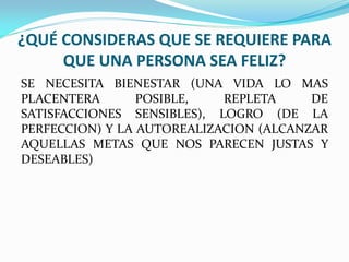 El documento discute los requisitos para ser feliz, incluyendo el bienestar, el logro y la autorrealización. Explica la diferencia entre la virtud y el vicio a través del ejemplo de dos hermanos, uno con talento para el fútbol y el otro drogadicto. También describe el proyecto de felicidad del autor como estudiar para tener éxito, formar una familia y ser un ejemplo a seguir, y los factores a considerar para tomar decisiones justas como la seguridad en uno mismo y ayudar a los demás.